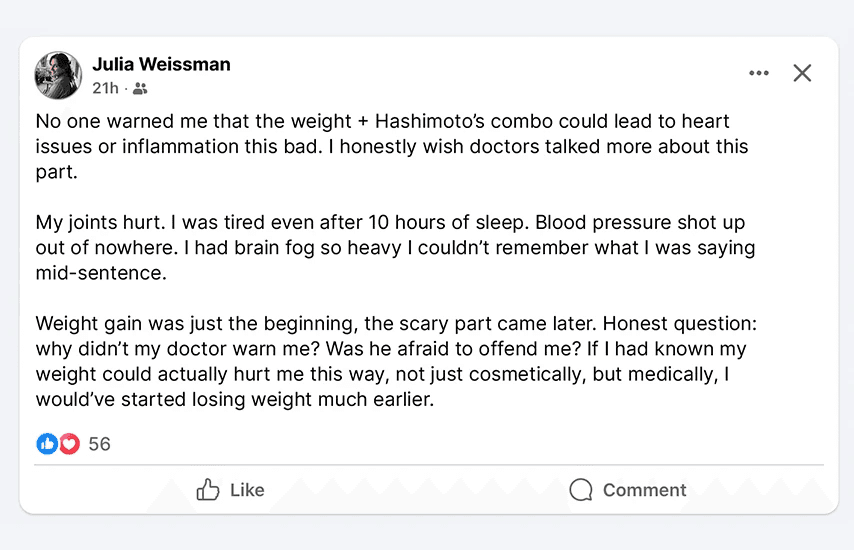 “Julia’s experience reflects what so many women tell me in private,” Dr. Hale says. “They aren’t warned that weight gain with Hashimoto’s is inflammatory. It’s cardiovascular. It’s systemic.
